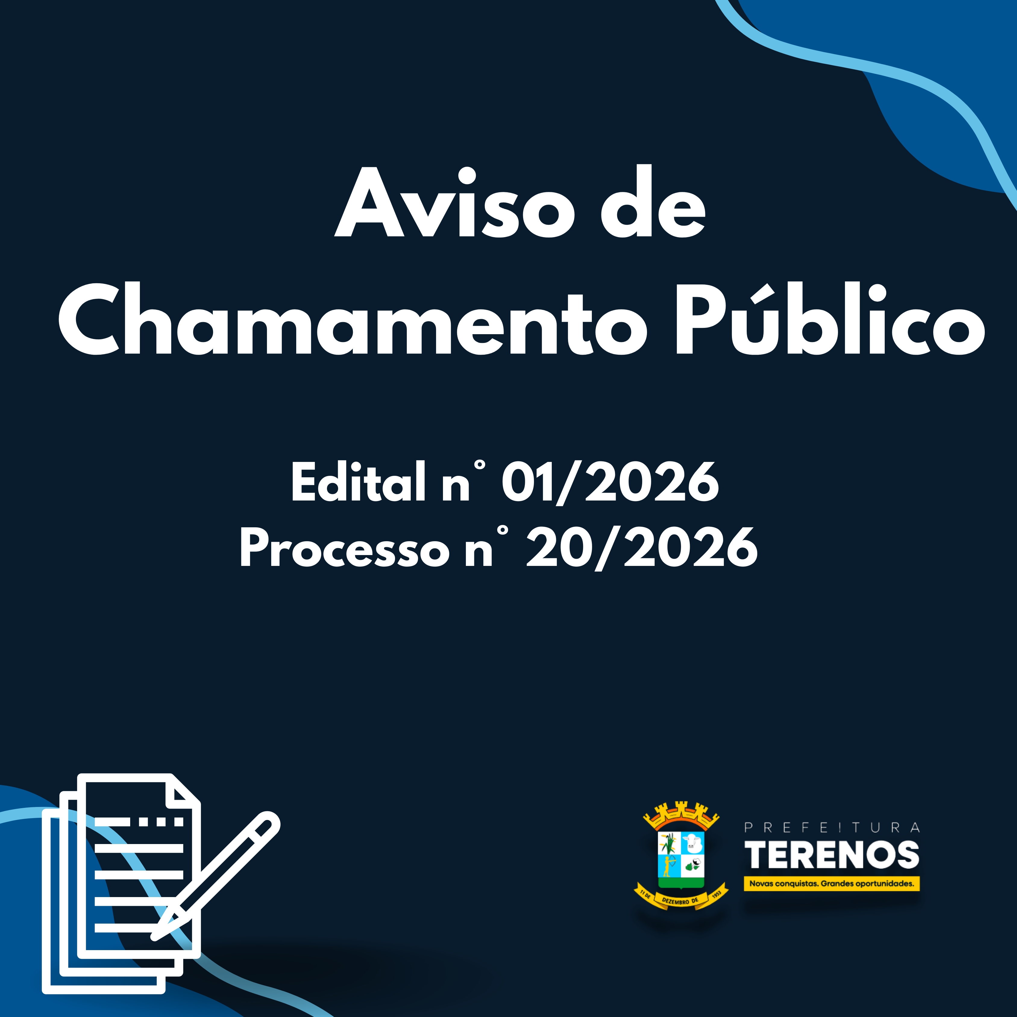 O MUNICÍPIO DE TERENOS/MS, TORNA PÚBLICO aos interessados, que promoverá CHAMAMENTO PÚBLICO, para atendimento do objeto abaixo descrito: